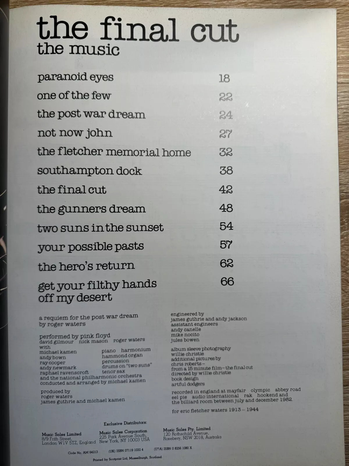 Το The Final Cut είναι ένα από τα πιο συναισθηματικά και πολιτικά φορτισμένα άλμπουμ των Pink Floyd, γραμμένο κυρίως από τον Roger Waters. Αυτό το επίσημο songbook περιλαμβάνει παρτιτούρες για πιάνο, φωνή και κιθάρα, δίνοντας τη δυνατότητα στους μουσικούς να ερμηνεύσουν κάθε κομμάτι με πιστότητα στις πρωτότυπες εκτελέσεις.